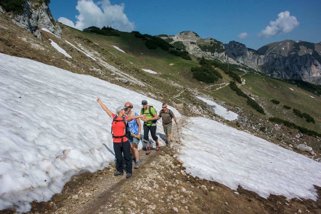 Es lässt sich bei einem Wanderurlaub im Frühling nicht ganz vermeiden. Ein Schneefeld bedeckt den Weg. Soll ich es überqueren oder muss ich umdrehen?