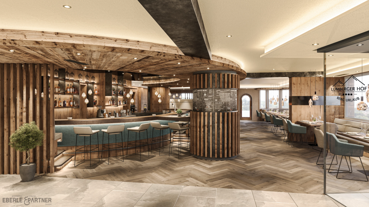 Hier haben wir einen Einblick in den neuen Eingangsbereich des Lumberger Hof. Rechts befindet sich der Haupteingang, der erste Blick fällt auf die Bar und einen neu gestalteten, lässigen Sitzbereich. Bestimmt wirst du hier ein paar lustige Urlaubsstunden verbringen. Dieser Bereich wird schon zur Hoteleröffnung am 30.5.2024 abgeschlossen sein.