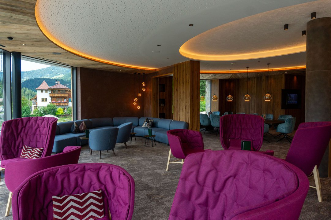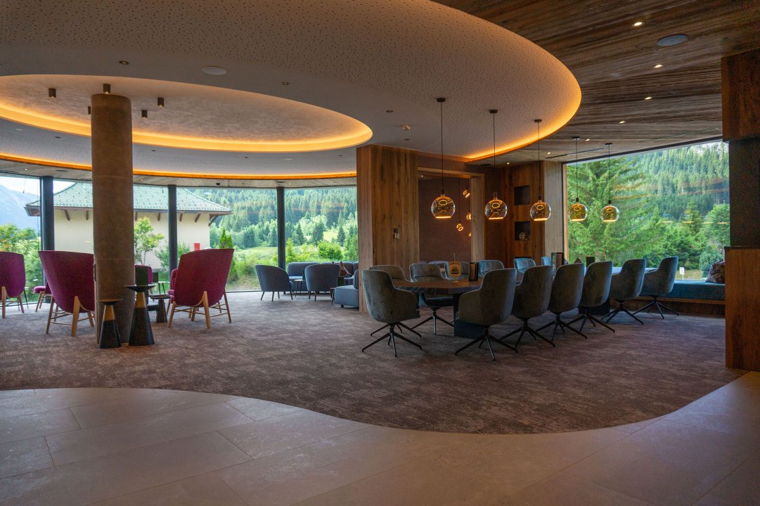 Die Hotelhalle mit Panoramafenster und Blick auf das Gaishorn: