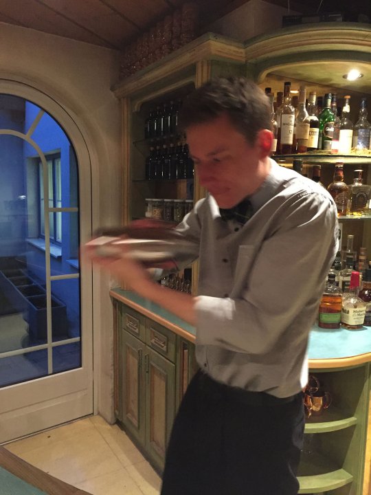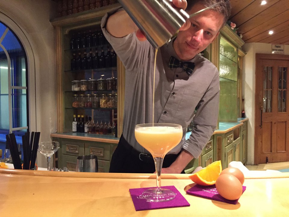 Der ist total im Stress, der arme Osterhase. Die frühen Feiertage und der viele Schnee, machen ihm zu schaffen. Wir inspizieren die verloren gegangenen Ostereier. Alle noch ganz. Aber die sind ja noch gar nicht angemalt, roh sind sie bestimmt auch noch. Das Eierpecken ist somit auf später verschoben. David hat eine gute Idee. Eier verleihen einem Cocktail eine feine, cremige Konsistenz. Also ab in den Shaker damit. Verfeinert mit edlem Marillenschnaps wird geschüttelt, viel schütteln. Eine Orangenschale auf den Cocktail reiben, das duftet und schmeckt. „Auf Ostern 2018“.