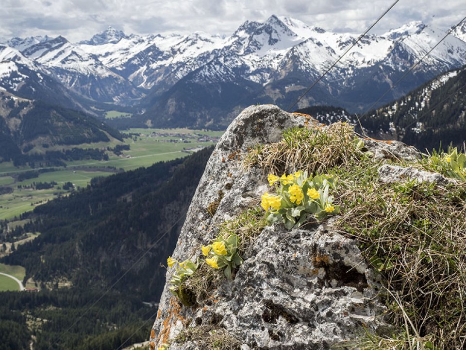 Ich komme an der Bad Kissinger Hütte vorbei. Kein Mensch ist zu sehen, die Hütte ist noch geschlossen. Es ist nicht mehr weit zum Gipfel, weiter geht’s. Schnee! Schnee? Schnee! Was nun? Soll ich umkehren? Wäre ja auch keine Schande. Beim Frühlingswandern im Tannheimer Tal muss das auch einkalkuliert werden. Doch ich finde einen Durchgang, nicht an der Kette wo der gesicherte Weg verläuft. Ein paar Meter weiter gibt es einen guten Weg. Der Aggenstein ist mein Hausberg, ich war schon so oft hier oben und weiß dass die Kraxelei nicht sehr anspruchsvoll ist. Also auf zum Gipfel, nach kurzer Kraxelpassage bin ich oben. Ich blicke einmal ringsum, ein Blick der mir sehr vertraut ist. Die schneebedeckten Gipfel der Allgäuer Alpen, unter mir das langsam grün werdende Tannheimer Tal. Den Lumberger Hof kann ich auch gut sehen. Ich glaube Kathi sitzt beim Kaffeetrinken auf der Terrasse!? Auf der anderen Seite sehe ich die weite Landschaft des Allgäus, die Berge werden zu Hügeln und es wird immer flacher. Bei der Gipfelrast bekomme ich doch noch Gesellschaft, eine Alpendohle will aus meinem Rucksack die Brotzeit klauen. Na dann, Berg heil!