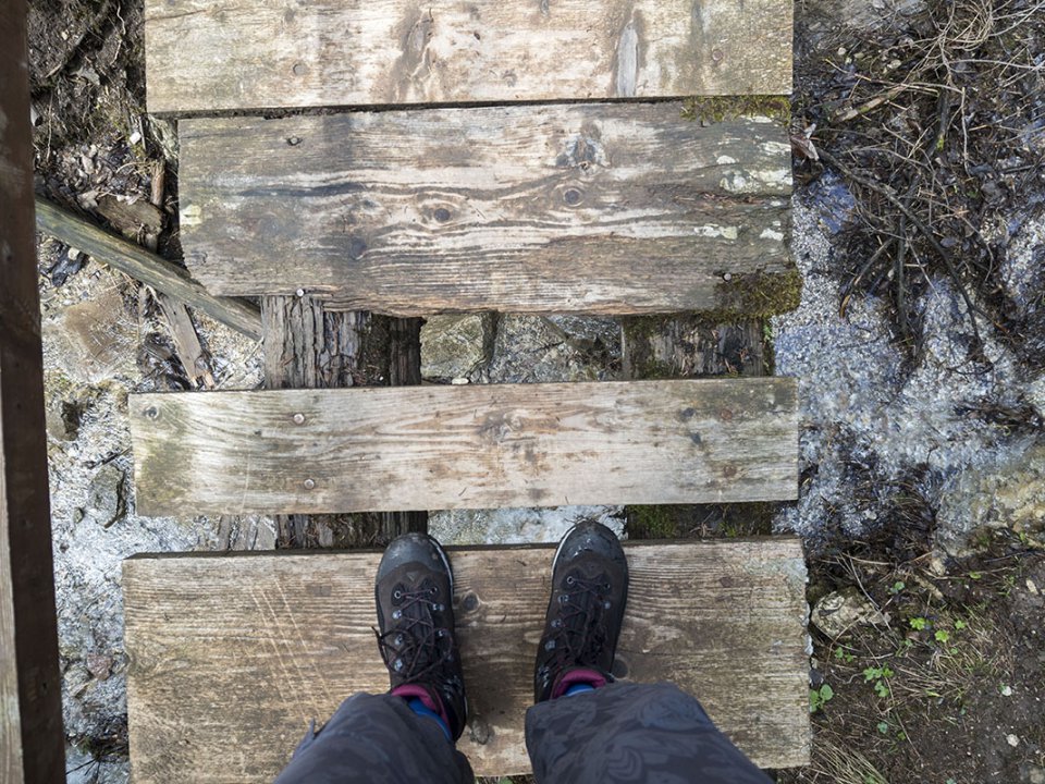 Ich freu mich unterwegs zu sein. Überall finde ich Frühlingsboten: lila Krokus und gelbe Himmelschlüssel stehen auf dem nassen Frühlingsboden. Das Gras ist noch nicht ganz grün, eher nass und braungrau. Der Bach donnert laut hinab, von der Schneeschmelze vollgefüllt mit Wasser. Eiskaltes Wasser, ich spüre die Kälte schon von weitem. Ich greife in den Bach, das fühlt sich an wie tausend Nadelstiche. Gefriert Wasser nicht bei 0°, fühlt sich eher an wie -20°. Mir wird aber gleich wieder warm. Jetzt geht es bergauf. Wurzeln, Stufen, Steine langweilig ist der jedenfalls Pfad nicht.