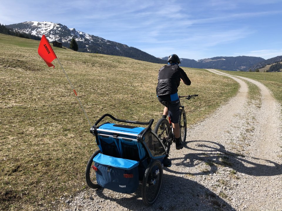 Diese Tage meldet sich der Frühling zurück. Sonnenstrahlen und so schön warm. Höchste Zeit, dass mit dem Fahrradanhänger in den Griff zu bekommen. Ich habe euch bis jetzt verschwiegen, dass wir im letzten Sommer schon einmal geradelt sind. Vielleicht habe ich es auch verdrängt. Nur so viel. Es war nicht gut. Für keinen Beteiligten. Verständlich, dass ich auch heuer meine Zweifel hatte. Also fix fertig startklar sein. Was gar nicht so leicht ist bei der ersten Radrunde des Jahres. Ich finde meinen Helm nicht, während die Männer startklar auf mich warten. So was passiert sonst nieeee. Jetzt aber. Fix fertig, startklar. Das Kind ist mit allen nötigen Accessoires und Entertainment in den Anhänger geschnallt. Danke Oma für das Spielzeug, das „brumm, 1,2,3,4, spielen wir“ singt. Wir rollen gemütlich Richtung Tannheim. Kind schläft nicht, schreit aber auch nicht, drückt pausenlos auf den „brummm“ Knopf. Seither sind wir 3 Mal die Woche mit dem Rad unterwegs „brumm“.