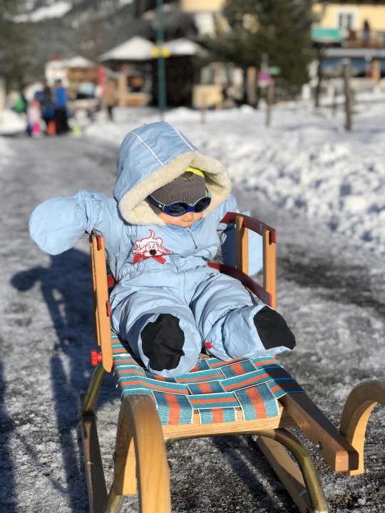 Auch im Winter, wenn die Temperaturen moderat waren, sind wir zwei eng umschlungen gewandert. Ein paar Mal sind wir mit dem Rodel ausgerückt. Ich war etwas nervös, dass mir der schlafende Schlingel vom Rodel fallen könnte. Alles gut gegangen. Er hat so auch wirklich einmal eine Rodelabfahrt verschlafen. Da stellte sich schon die Frage: „Für wen mach ich das eigentlich? Für mich? Für das schlafende Skianzug-Knäul?“