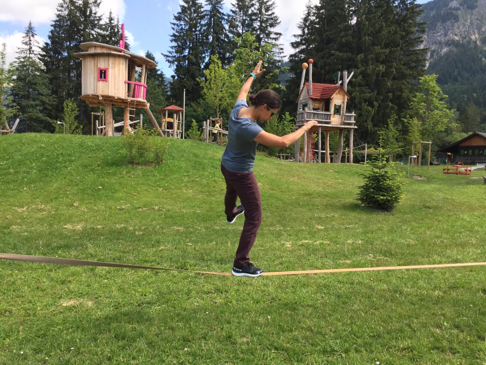 Der Gleichgewichts-Parcours ist für Kinder und Erwachsene spannend. Eine echte Herausforderung. Die Slackline wackelt ganz brutal hin und her, der erste Schritt ist der Schwerste. Da hilft die „Übungs-Slackline“ mit Halteseil, doch auch hier geht es ganz schön hin und her. Wer schafft den ganzen Parcours? Über die Baumstämme, die leichte Slackline dann die Schwere, über das Holzbrett und die Wackelbrücke? Der verirrt sich hoffentlich nicht im Irrgarten.