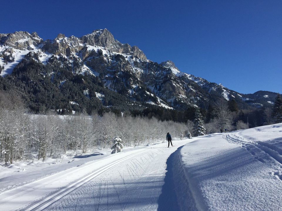 Die Loipe schlängelt sich hier in leichtem Auf und Ab zwischen Wald und See hindurch. Mit Schwung läuft der Ski und zieht eine Spur in den Schnee. Leicht hügelig geht es mit Speed um die Kurve, das taugt mir! Nebenbei die Kulisse! Der graue Fels der Rot Flüh wird von der Sonne angestrahlt. Der Haldensee im Gegensatz wirkt eisig kalt, ein dünner Wolkenschleier hängt über dem Eis.