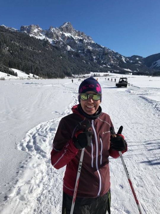 Retour fahre ich, wenn es möglich ist über den See. Hier ist der wohl einzigen Loipenkilometer im Tannheimer Tal, der komplett flach verläuft. Die Loipe auf Eis fährt sich ANDERS und unterscheidet sich oft von Tag zu Tag. Liegt eine dünne, griffige Schneeschicht, läuft es richtig gut. Ehrlich gesagt läuft es aber meistens eher bescheiden. Eis und Schnee verbinden sich zu einem wackeligen Untergrund, so schieb ich mich mit kurzen Schritten übers „Wasser“. Klingt auch nicht sehr einladend? Ich glaube, ich will euch meine Lieblingsrunde gar nicht gschmackig machen. Damit ich weiterhin alleine am See entlang rauschen kann, ganz in der Stille der Natur.
